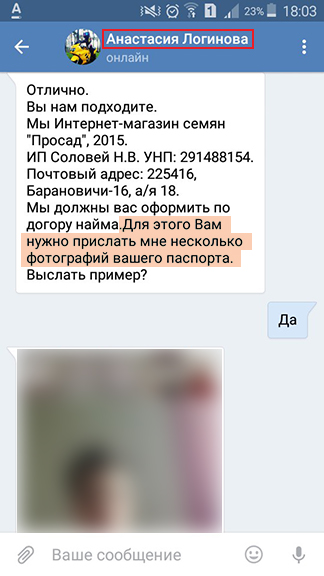 | Пример объявления мошенников | Предлагают, якобы, "работу" | И просят выслать фото документов |