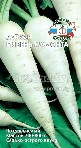 Дайкон Бивень мамонта - позднеспелый сорт. Период от всходов до сбора: 65-75 дней.