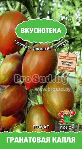 Томат Гранатовая капля - томат-черри. Среднеспелый сорт для плёночных теплиц и открытого грунта. Период от всходов до начала созревания: 100-110 дней. Сладкого фруктового вкуса.