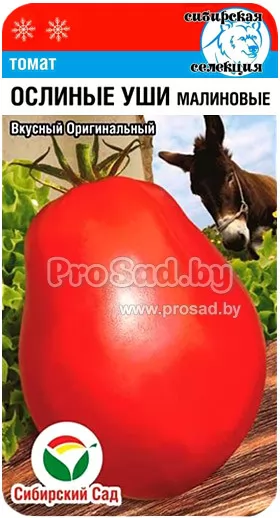 Томат Ослиные уши Малиновые - оригинальный среднеспелый сорт с крупными малиновыми плодами по форме напоминающими ослиное ухо. От высадки рассады до сбора плодов 100-110 дней. Рекомендуется для выращивания в теплицах и открытом грунте в коловой культуре.