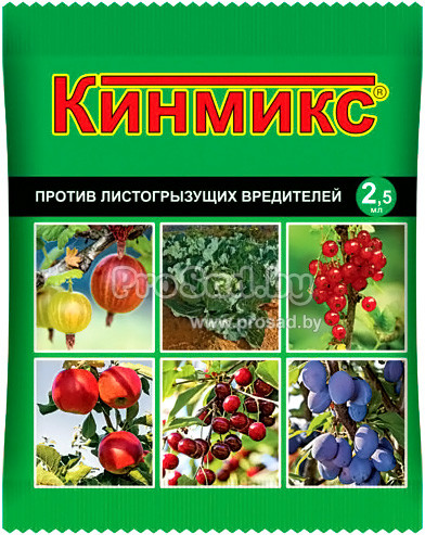 - Кинмикс - инсектицид - относится к группе пиретроидов, обладает низкой токсичностью для теплокровных, эффективен против большинства вредителей на основных садовых (яблоня, слива, вишня, черешня, крыжовник, смородина), а также огородных (капуста) культурах (кроме популяций вредителей, обладающих резистентностью к пиретроидам).