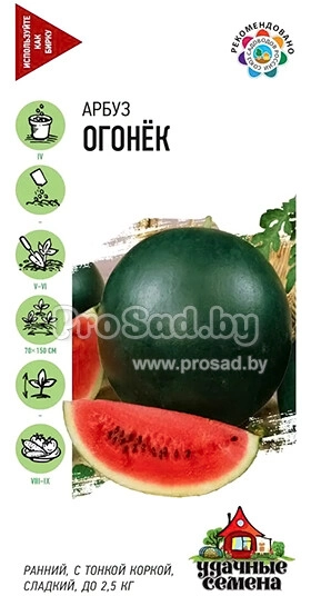 Арбуз Огонёк - раннеспелый урожайный сорт. Период от полных всходов до первого сбора плодов: 71-87 дней. Предназначен для выращивания в плёночных теплицах и в открытом грунте.