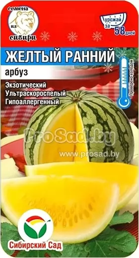 Арбуз Жёлтый ранний - экзотический, ультраскороспелый сорт арбуза с необычной жёлтой мякотью. Особенно интересен людям страдающим аллергией на красное. От всходов до первого сбора урожая всего: 54-58 дня. Рекомендуется для выращивания в открытом грунте и под плёночными укрытиями.